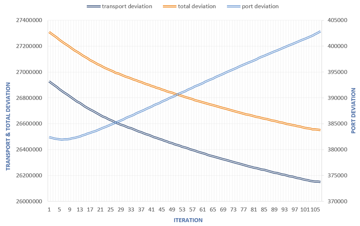 Applied to freight movements between the Netherlands and Belgium, the model generated sets of valid multimodal chain alternatives. By implementing machine learning — specifically the Expectation-Maximisation (EM) algorithm — it was possible to predict demand share distributions across these alternatives and successfully minimise deviations between predicted flows and observed data from Eurostat. Two datasets, transport flows and port activity statistics, were used as reference points. The model consistently reduced overall deviation until convergence, indicating that the framework reached the best possible performance given the available input data and inherent trade-offs. This demonstrates that combining graph-based path construction with unsupervised learning offers a practical, data-driven approach for multimodal freight transport modelling.